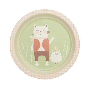 The Prairie Kitty Bamboo Mini Plate features a kind kitty on the prairie with a shaggy sheep, a curious chick on a wispy wheat background, and a gi...