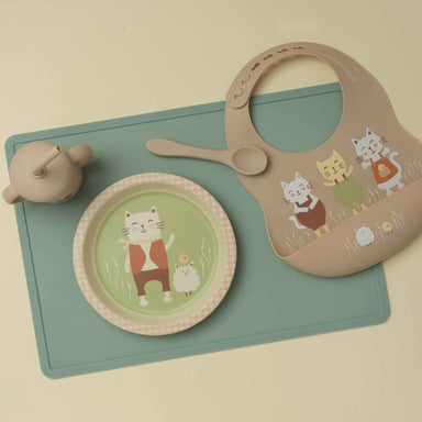 The Prairie Kitty Fresh & Messy Bib & Spoon Set features kind kitties on the prairie with shaggy sheep and curious chicks on a wispy wheat...