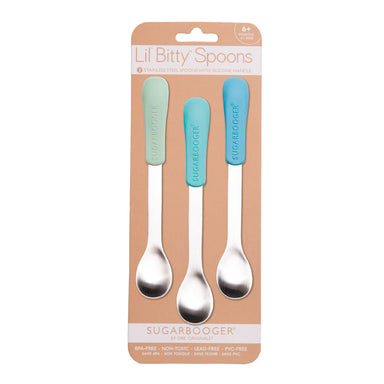 The Baby Blue Lil' Bitty Spoon Set features three stainless steel spoons with silicone handles in three shades of blue that match with your mealtim...